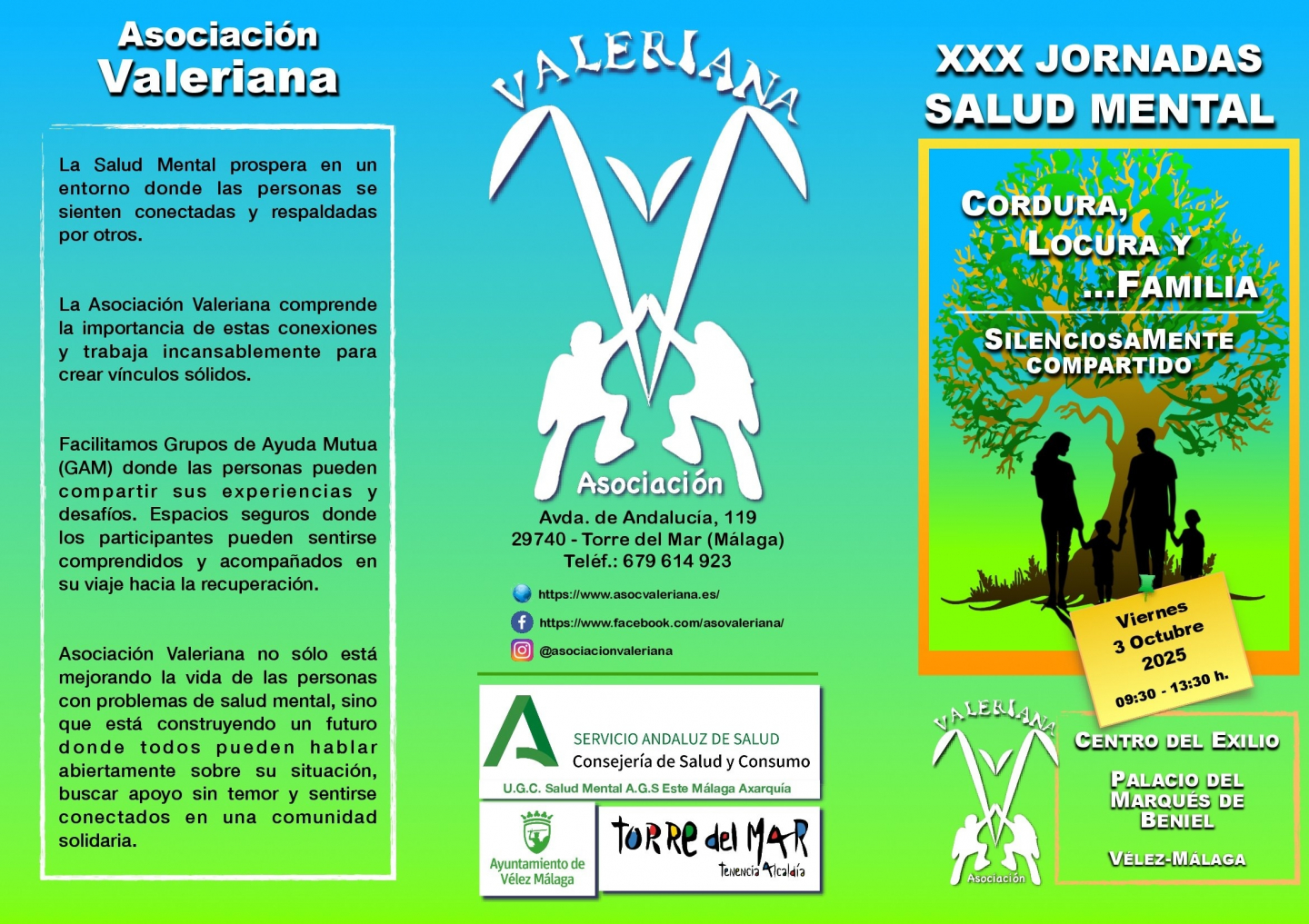 El Ayuntamiento de Vélez-Málaga y la Asociación para la Promoción y la Prevención de la Salud Mental “Valeriana” presentan la XXX edición de Jornadas de Salud Mental, que tendrán lugar el viernes 3 de octubre en el Centro del Exilio – Palacio del Marqués de Beniel. Esta jornada, que cuenta con la colaboración del Consistorio y la Consejería de Salud y Consumo de la Junta de Andalucía, está enfocada en la familia y su repercusión en la salud mental.