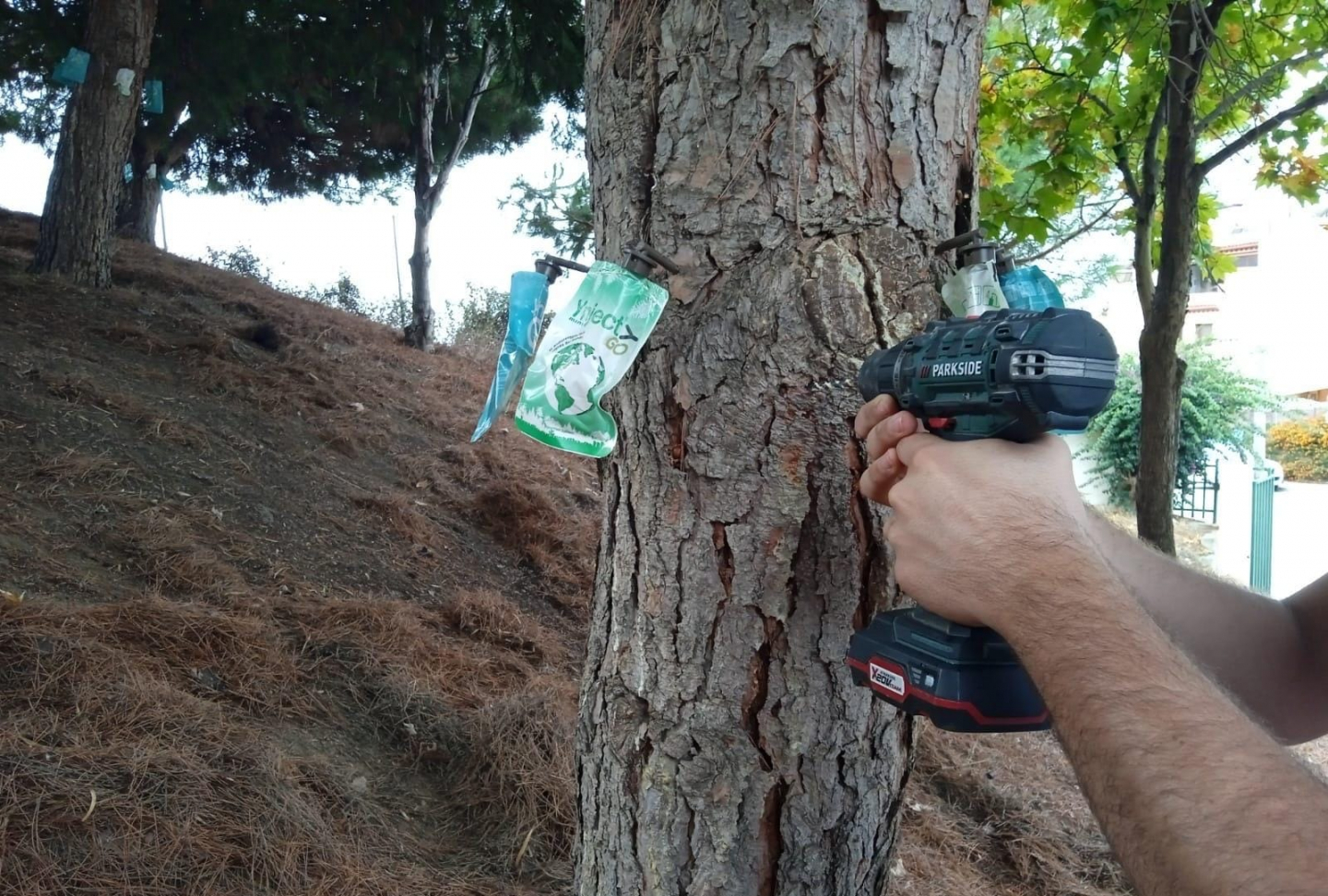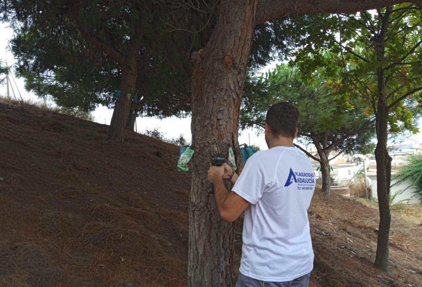 Es por ello que, desde Parques y Jardines, los servicios operativos de Medio Ambiente del Ayuntamiento de Vélez-Málaga han comenzado con unas actuaciones de control a implementar durante la campaña enfocados en la endoterapia a baja presión. Dicho tratamiento consiste en la inyección en tronco, a baja presión, de un plaguicida. La intervención se efectúa a través de un orificio con una broca metálica, en él se inserta una cánula al que se conecta un dispositivo presurizado que contiene la materia activa en disolución. Dicho producto penetra en los tejidos vegetales y, cuando las larvas ingieren las acículas de las que se alimentan, se envenenan y mueren.