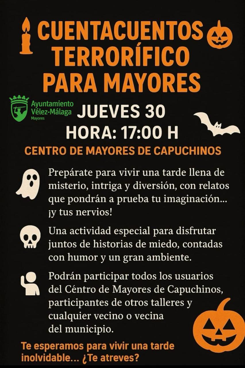 El transcurso del cuentacuentos discurrirá a través de la narración de experiencias terroríficas y sensoriales, con una introducción de varios relatos del género vinculados a Vélez-Málaga, que darán paso a la interactividad de los usuarios, relatando sus experiencias personales o que sepan han sucedido. El broche final lo pondrá un baile del terror con disfraces para la ocasión. “Animo a nuestros veteranos a mantener esa vitalidad, ganas de aprender y de pasarlo bien que siempre tienen en esta actividad, en la que podrán participar todos los usuarios del centro, de otros talleres y cualquier vecino que lo desee”, ha zanjado el concejal.