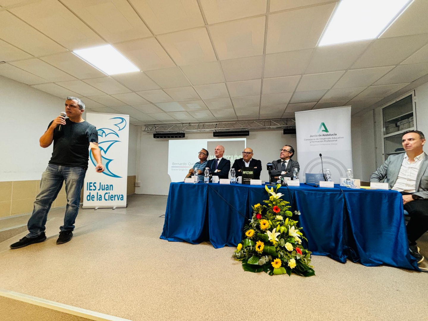El IES Juan de la Cierva de Vélez-Málaga ha sido hoy el escenario de un acto muy especial en el que Miguel Briones, delegado territorial de Desarrollo Educativo y Formación Profesional y de Universidad, Investigación e Innovación, ha entregado oficialmente el libro Infectado, del ingeniero y emprendedor veleño Bernardo Quintero. La obra, editada por Fundación Unicaja, se distribuirá en centros educativos de toda la provincia de Málaga, pero hoy se ha puesto el foco en los institutos de nuestro municipio, reforzando su papel como referentes de inspiración y formación.