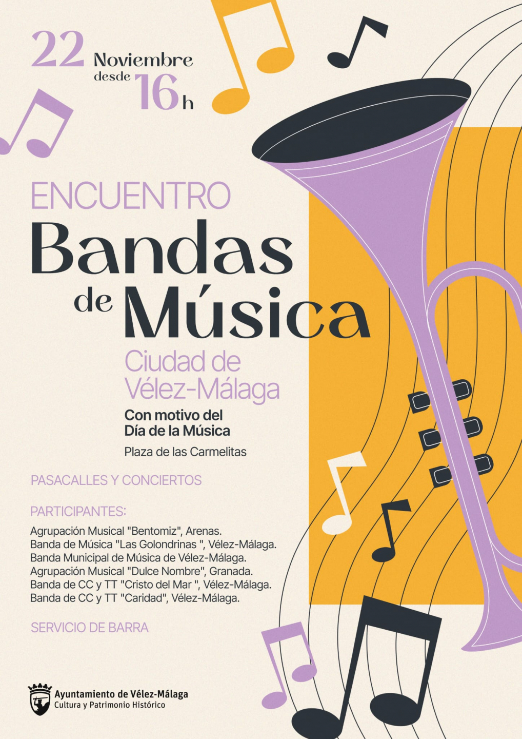 El Encuentro de Bandas de Música “Ciudad de Vélez-Málaga”, aderezado por la coordinación de pasacalles, conciertos y múltiples sorpresas, contará con un cartel de actuaciones de absoluto relumbrón, con la intervención estelar de nuestra Banda Municipal de Música como anfitriona. Junto a ella, otorgarán lustre a la cita la agrupación musical “Bentomiz” (Arenas), la banda de música “Las Golondrinas” (Vélez-Málaga), la agrupación música “Dulce Nombre” (Granada), la Banda de Cornetas y Tambores “Cristo del Mar” (Vélez-Málaga) y la Banda de Cornetas y Tambores de la Caridad.