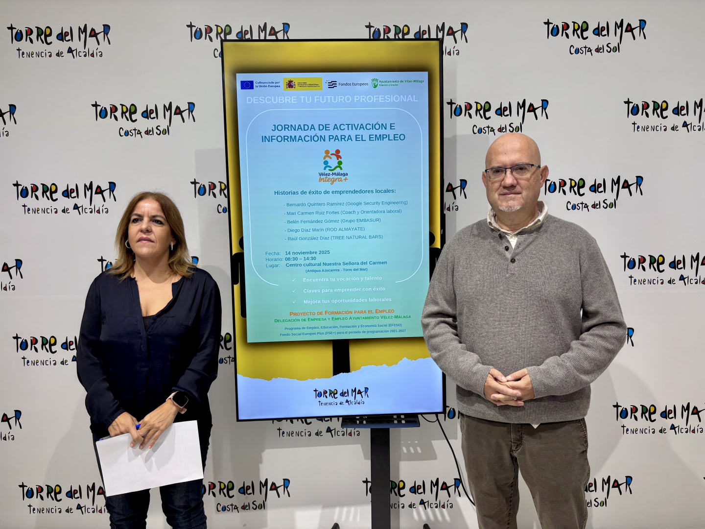 El primer teniente de alcalde del municipio de Vélez-Málaga y teniente de alcalde de Torre del Mar, Jesús Pérez Atencia, junto a la concejala de Empresa y Empleo, Belén Zapata, han presentado en la mañana de este miércoles unas interesantes jornadas de activación y formación para el empleo que se van a celebrar este viernes en el edificio del Centro Cultural Nuestra Señora del Carmen – Antigua Azucarera.