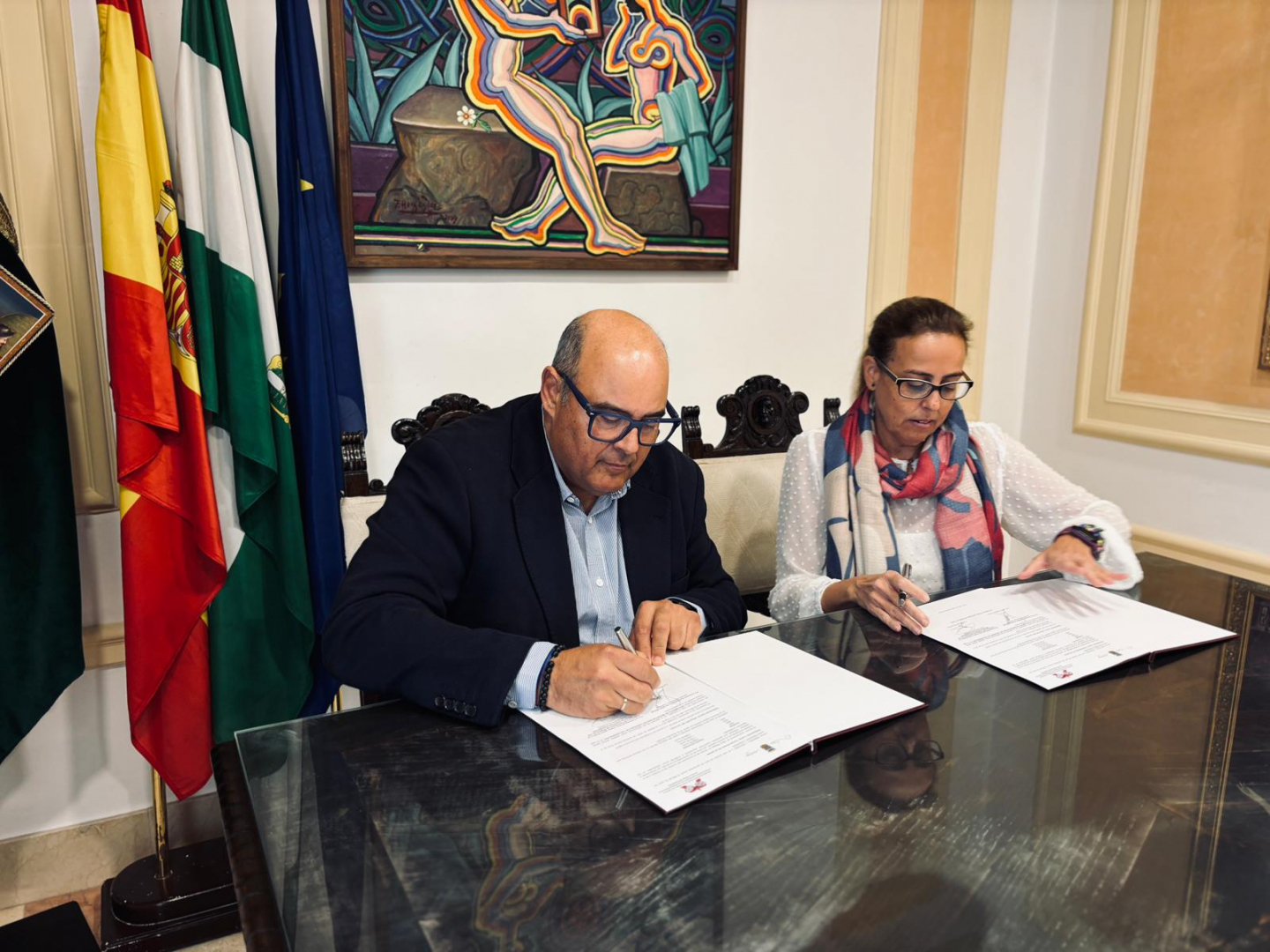 El Ayuntamiento de Vélez-Málaga continúa reforzando su compromiso con la educación y el reconocimiento al mérito académico de los jóvenes del municipio. En la Sala Noble del Consistorio, el alcalde Jesús Lupiáñez y la hermana mayor de la Cofradía de los Estudiantes, Raquel García, firmaron este viernes la modificación del convenio de colaboración que regula el premio al mejor expediente de Bachillerato “Ciudad de Vélez-Málaga”, un acto que contó también con la presencia de la concejala de Educación, Lourdes Piña.
