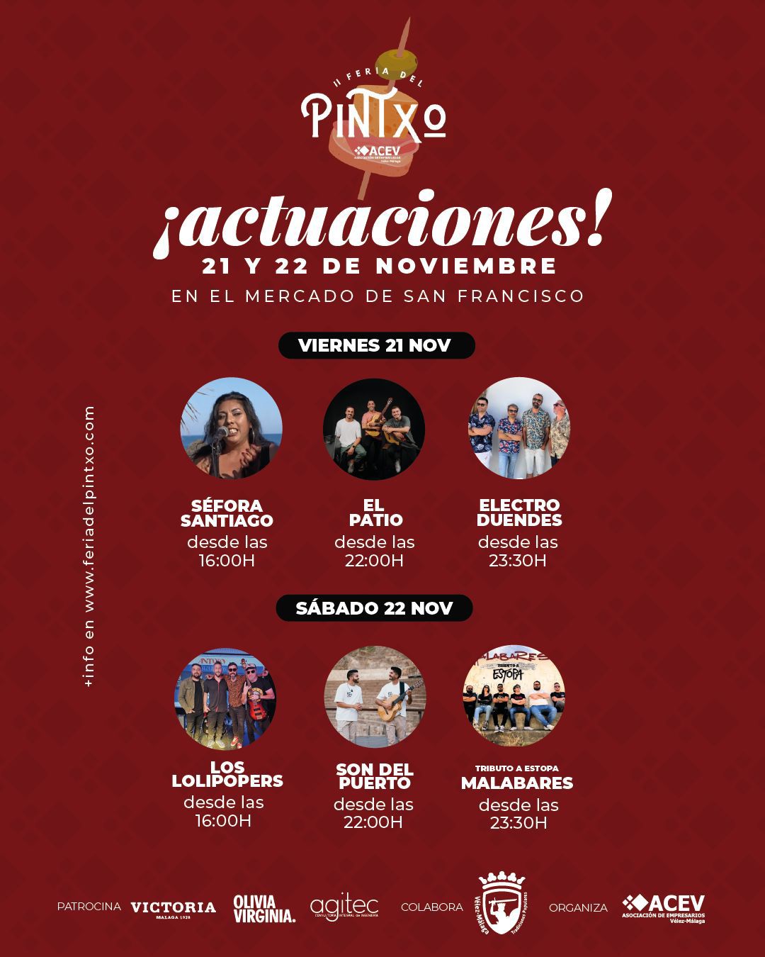 En el apartado de actuaciones musicales, el viernes amenizarán la jornada: Séfora Santiago (a partir de las 16:00 horas); El Patio (sobre las 22:00 horas); y Electroduentes (23:30 horas). El sábado harán lo mismo: Los Lolipopers (16:00 horas); Son del Puerto (22:00 horas); y Malabares (23:30 horas). Durante ambos días, el Mercado de San Francisco abrirá sus puertas a partir de las 13:00 horas hasta las 02:00 horas. Los establecimientos participantes ofrecerán ‘pintxos’ hasta las 17:00 horas, y desde las 19:30 horas a medianoche, mientras los asistentes podrán consumir bebidas y disfrutar del espectáculo.