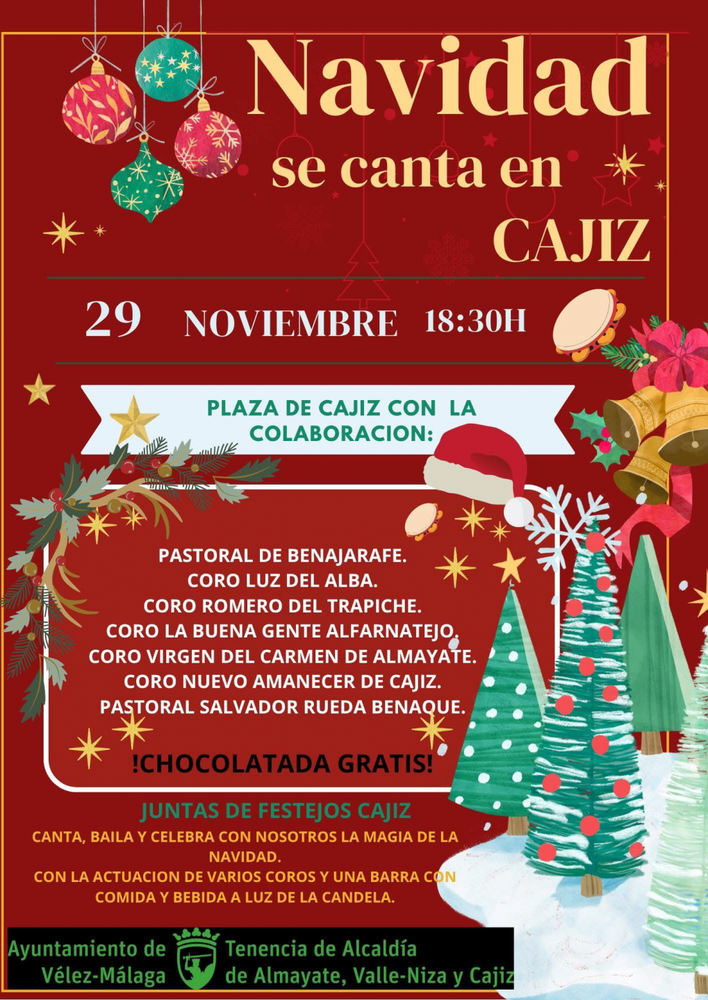 Vélez-Málaga y sus núcleos poblacionales se preparan para vivir uno de los momentos más esperados del año: la Navidad. Como antesala a las festividades y a la llegada de Papá Noel y los Reyes Magos, la Tenencia de Alcaldía de Cajiz y los Mayordomos del núcleo han organizado el Encuentro de Coros y Pastorales que tendrá lugar el próximo sábado, 29 de noviembre, a partir de las 18:30 horas.