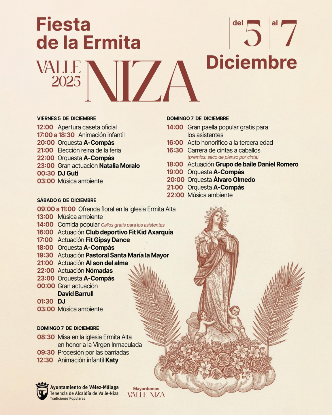 El domingo 7 de diciembre comenzará temprano en Valle-Niza con la Misa en la Iglesia Ermita Alta en honor a la Virgen Inmaculada de la Concepción. Tras la ceremonia, la imagen recorrerá las calles del núcleo, un “momento de verdadera pasión, fervor religioso y tradición”, como ha destacado el teniente de alcalde, Jesús María Claros. Una vez finalizada esta esperada procesión, será el turno de la animación infantil de Katy, seguida de otra actividad muy significativa: la gran paella popular gratuita para todos los asistentes “el momento idóneo para unir lazos y celebrar como hermanos”. Los mayores también tendrán su espacio con un acto honorífico dedicado a la tercera edad, mientras que los aficionados a la equitación podrán participar en la tradicional carrera de cintas a caballo. La fiesta continuará con el Grupo de Baile Daniel Romero, y el ritmo no parará hasta la noche con las actuaciones de las Orquestas A-Compás y Álvaro Olmedo.
