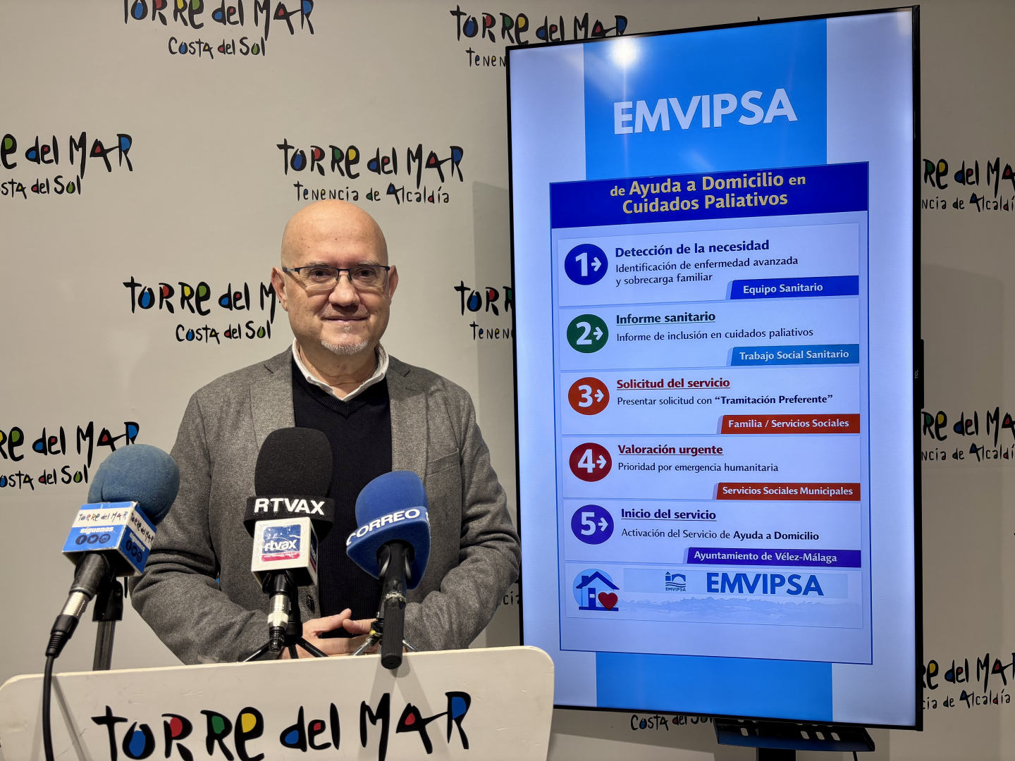 El primer teniente de alcalde del municipio de Vélez-Málaga y concejal delegado de la Empresa Municipal EMVIPSA, Jesús Pérez Atencia, ha presentado en rueda de prensa el Programa Municipal de Ayuda a Domicilio en Cuidados Paliativos, una iniciativa pionera destinada a ofrecer una respuesta rápida y eficaz a personas en situación de enfermedad avanzada y a sus familias.