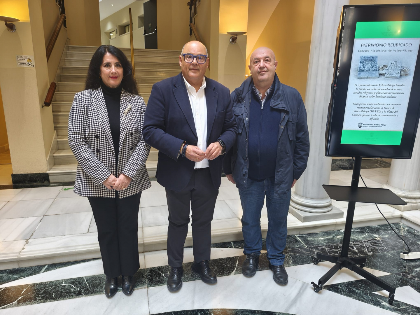 Por consiguiente, la Concejalía de Cultura y Patrimonio ha decidido reubicar los escudos de armas, escudos religiosos y placas conmemorativas que se aglutinaban en los depósitos municipales del antiguo edificio Mercovélez a lugares más adecuados hasta que se decida su colocación definitiva. “Somos lo que somos, y Vélez-Málaga es lo que es hoy, gracias a esa historia que nos precede, a lo que nuestros antepasados lograron en virtud a su esfuerzo y dedicación. Durante décadas se construyó nuestra historia, por lo que es una obligación para nosotros aportar idéntica dedicación y esmero por conservar y preservar la riqueza artística, monumental y patrimonial que hace de nuestro municipio un referente a nivel andaluz y nacional en este sentido”, ha ensalzado el primer edil veleño, flanqueado en su comparecencia por la delegada municipal de Cultura y Patrimonio, Alicia Ramírez, y el técnico de Patrimonio, Emilio Martín Córdoba.