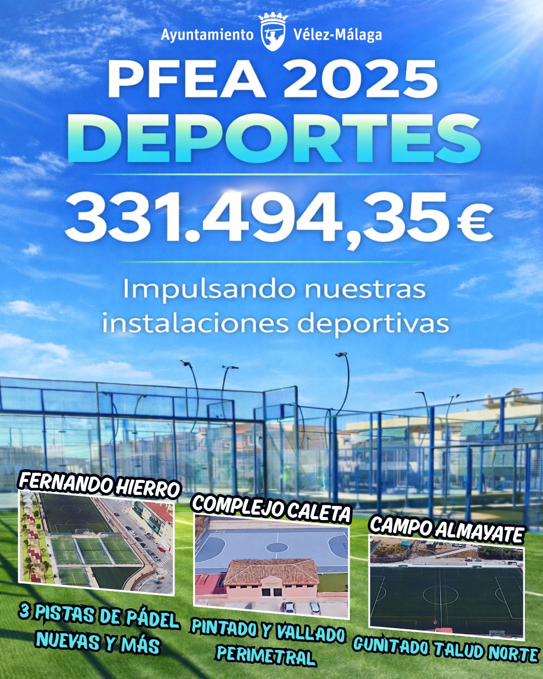 El Ayuntamiento de Vélez-Málaga, a través de su Concejalía de Deportes, ha dado a conocer un importante capítulo de actuaciones de mejora, acondicionamiento y modernización de diversas instalaciones deportivas que residen en el término municipal veleño, dando respuesta con ello a las demandas realizadas por parte de conjuntos, asociaciones y colectivos deportivos de la localidad. El edil responsable, Manuel Gutiérrez, ha desvelado una relevante inversión que será implementada en la ejecución de diversas acciones de renovación y adecuación de polideportivos, campos de fútbol y complejos de esta índole. El Ayuntamiento de Vélez-Málaga acometerá esta serie de intervenciones con un presupuesto total que asciende a 331.494,35 euros, financiados a través del Plan de Fomento de Empleo Agrario (PFEA) correspondiente al ejercicio de 2025 del Área de Deportes, en este caso, se trata de una ampliación inversora complementaria al año 2023.