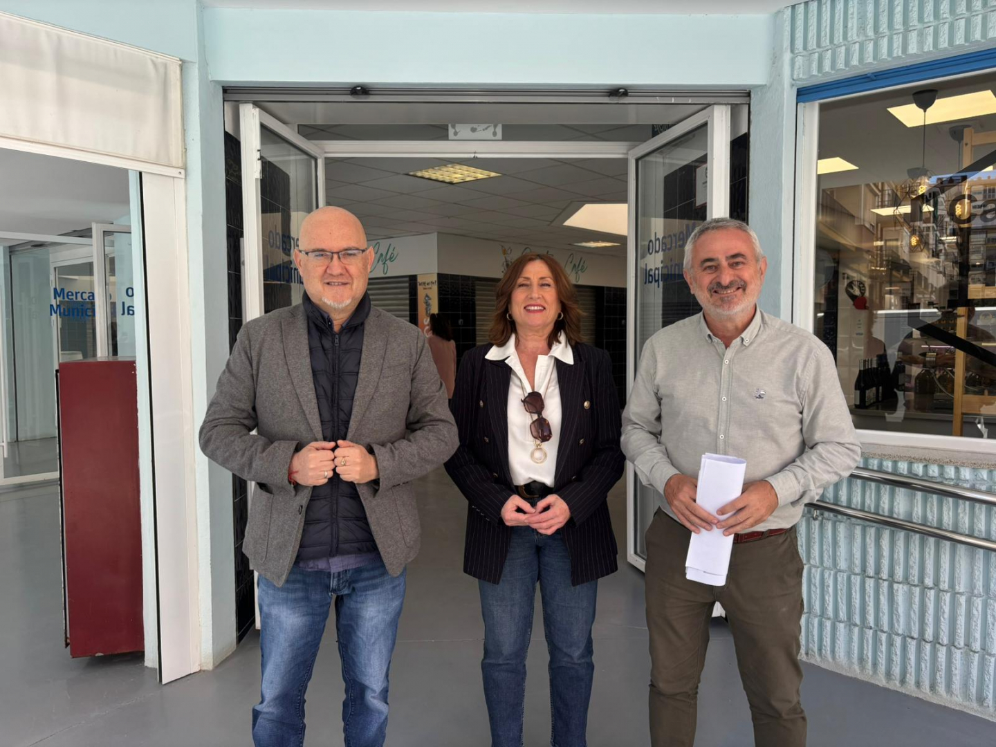 jesús Pérez Atencia, primer teniente de alcalde de Vélez-Málaga y teniente de alcalde de Torre del Mar, junto a la concejala de Industria y Comercio, Beatriz Gálvez, y el concejal de Infraestructuras y Edificios Municipales, Jesús María Claros, han presentado los nuevos trabajos de mejora que se ejecutarán en el Mercado de Minoristas de Torre del Mar, ubicado en calle del Río, dentro del Programa de Fomento de Empleo Agrario (PFEA).