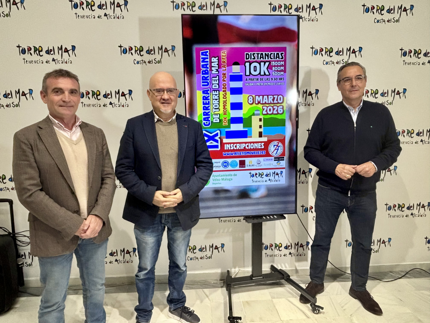 El primer teniente de alcalde del municipio de Vélez-Málaga y teniente de alcalde de Torre del Mar, Jesús Pérez Atencia, junto al concejal de Deportes, Manuel Gutiérrez, y el presidente del Club Atletismo Vélez–Rincón Fertilidad, Carlos Gámez, ha presentado en rueda de prensa la IX Carrera Urbana de Torre del Mar, que se celebrará el domingo 8 de marzo, a partir de las 9:30 horas, consolidándose como una de las citas deportivas más destacadas del calendario local.