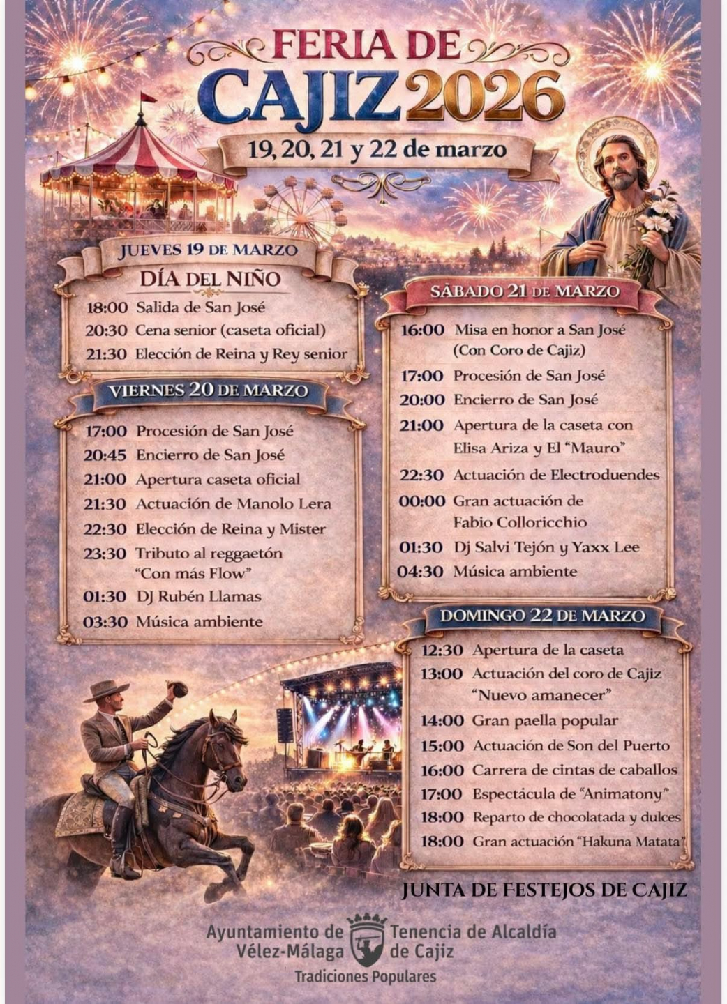 Con la llegada de marzo, Cajiz abre el calendario de ferias del municipio. El núcleo se prepara para vivir varios días de celebración, del 19 al 22 de marzo, en honor a su patrón, San José. La Tenencia de Alcaldía del núcleo, la Concejalía de Tradiciones Populares y los mayordomos de Cajiz han organizado una variada programación pensada para todas las edades, en la que destacan actividades litúrgicas, musicales y tradicionales.