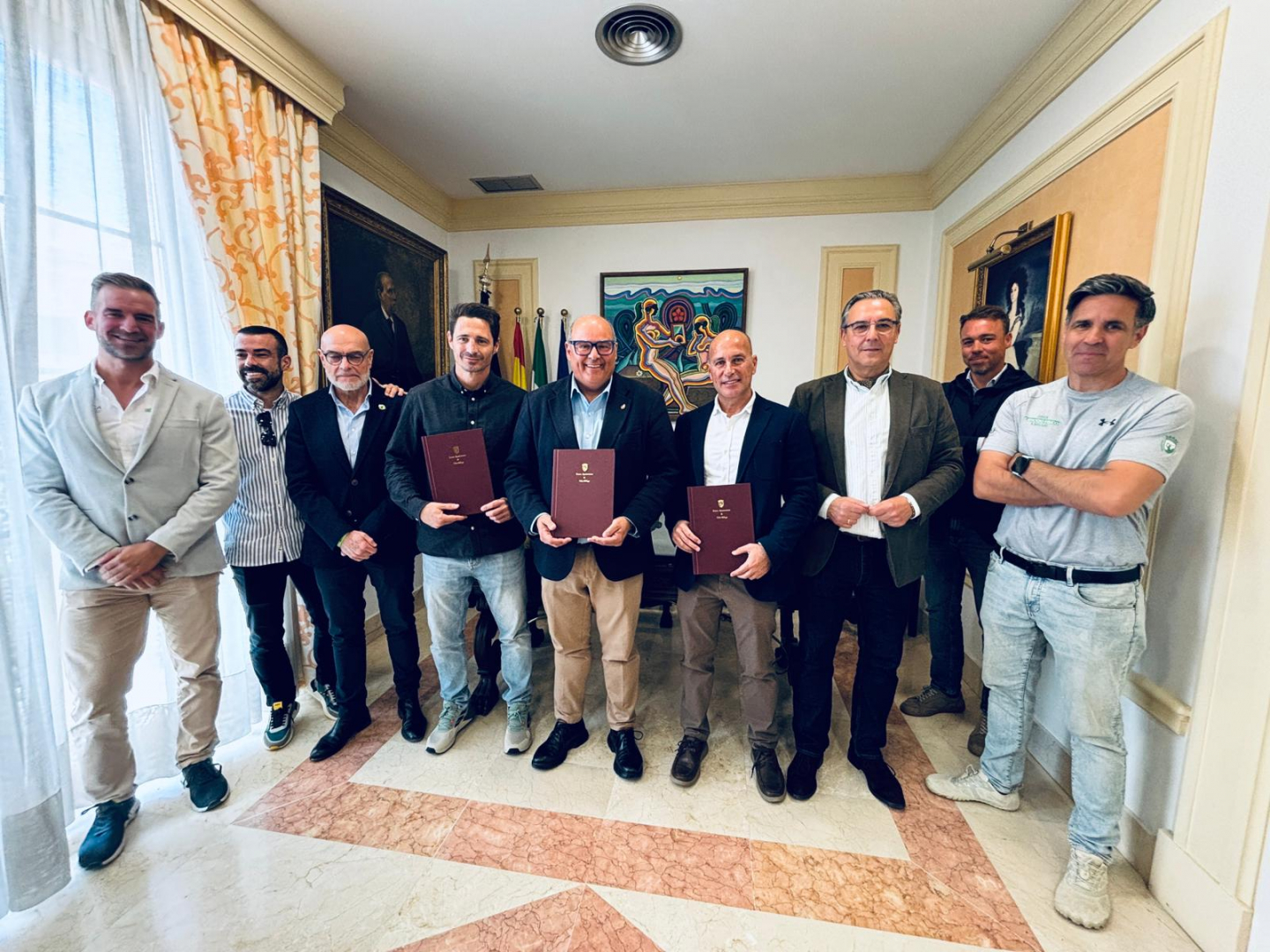 El alcalde de Vélez-Málaga, Jesús Lupiáñez, junto al concejal de Deportes, Manuel Gutiérrez, ha suscrito en el día de hoy un protocolo general de colaboración entre el Ayuntamiento, la Fundación UAPO (Unidad de Apoyo al Paciente Oncológico) y la asociación ASEFCA (Asociación de Ejercicio Físico Clínico), que permitirá la creación de una sede de esta fundación en Vélez-Málaga para ofrecer atención gratuita e interdisciplinar a pacientes oncológicos de toda la Axarquía.