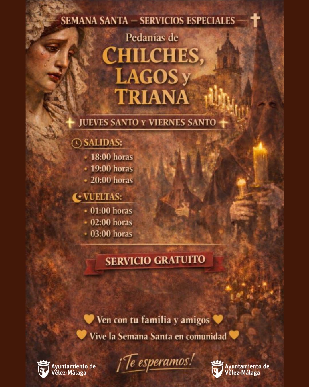 En concreto, se habilitará un servicio gratuito para los núcleos de Chilches, Lagos y Triana durante el Jueves y Viernes Santo, con salidas a las 18:00, 19:00 y 20:00 horas, y regresos a la 01:00, 02:00 y 03:00 horas. La línea de Chilches realizará paradas en Benajarafe, Valle-Niza, Almayate y Cajiz; la de Lagos en Mezquitilla y Caleta de Vélez; y la de Triana en El Trapiche.