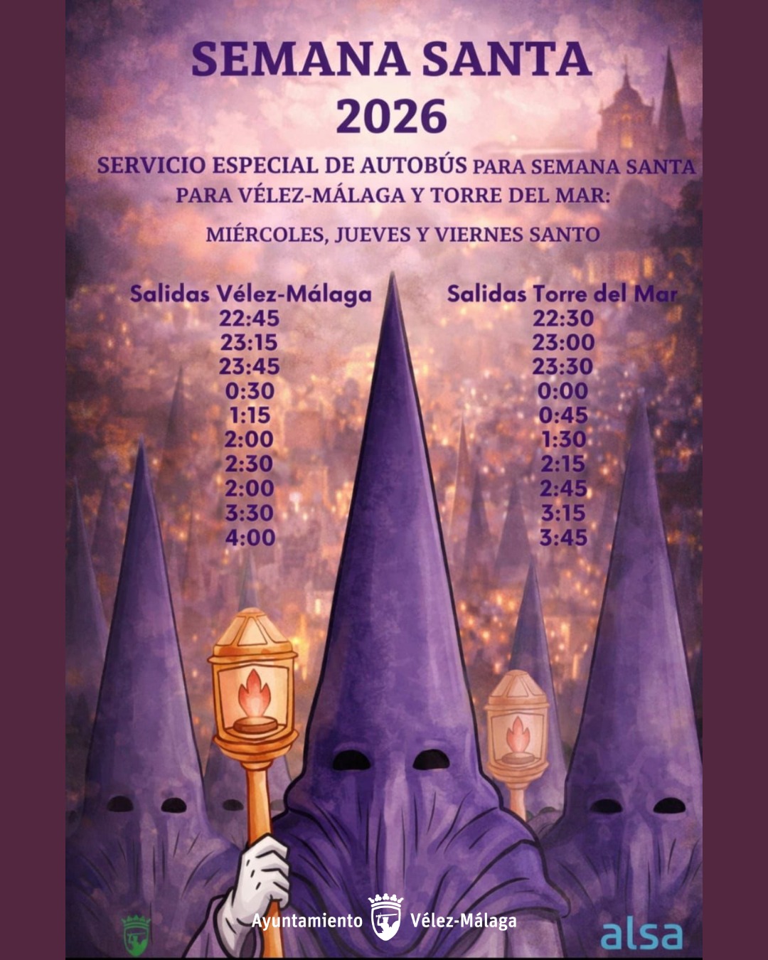 Las salidas desde Vélez-Málaga se realizarán a las 22:45, 23:15, 23:45, 00:30, 01:15, 02:00, 02:30, 03:30 y 04:00 horas, mientras que desde Torre del Mar partirán a las 22:30, 23:00, 23:30, 00:00, 00:45, 01:30, 02:15, 02:45, 03:15 y 03:45 horas.