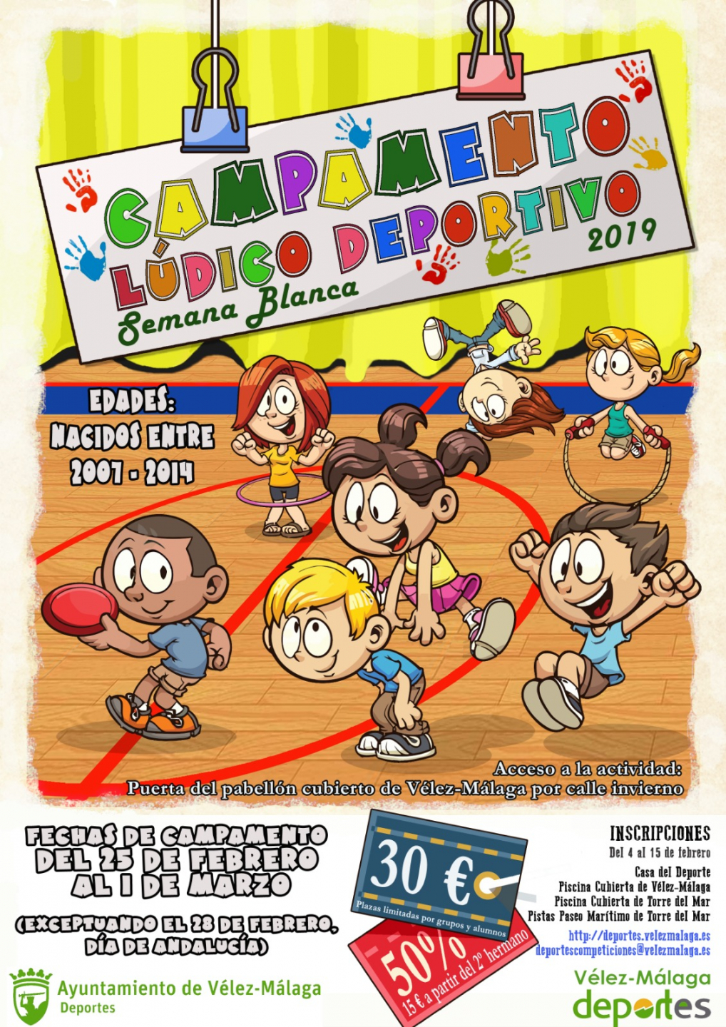 Vélez-Málaga, 1 de febrero de 2019. Un centenar de menores disfrutarán este año de una nueva edición del Campamento Lúdico-Deportivo que organiza el Ayuntamiento de Vélez-Málaga y que se desarrollará durante la 'Semana Blanca'. Las actividades tendrán lugar del 25 de febrero al 1 de marzo en las instalaciones del polideportivo Fernando Ruiz Hierro (exceptuando el 28 de febrero, Día de Andalucía).