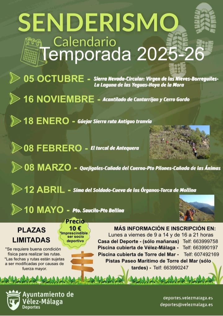 Vélez-Málaga refuerza su compromiso con el deporte y la vida saludable con la presentación del calendario de la temporada 25/26 de senderismo, que arrancará el 5 de octubre con una ruta muy demandada en Sierra Nevada. El programa, lanzado por la Concejalía de Deportes, incluye siete rutas de dificultad moderada que se desarrollarán entre octubre y mayo de 2026, “con el objetivo de fomentar la actividad física y promover hábitos saludables desde la infancia”, según ha explicado el concejal de Deportes del Ayuntamiento, Manuel Gutiérrez, que ha estado acompañado en la comparecencia de prensa por Francisco Valladares, técnico del Área.