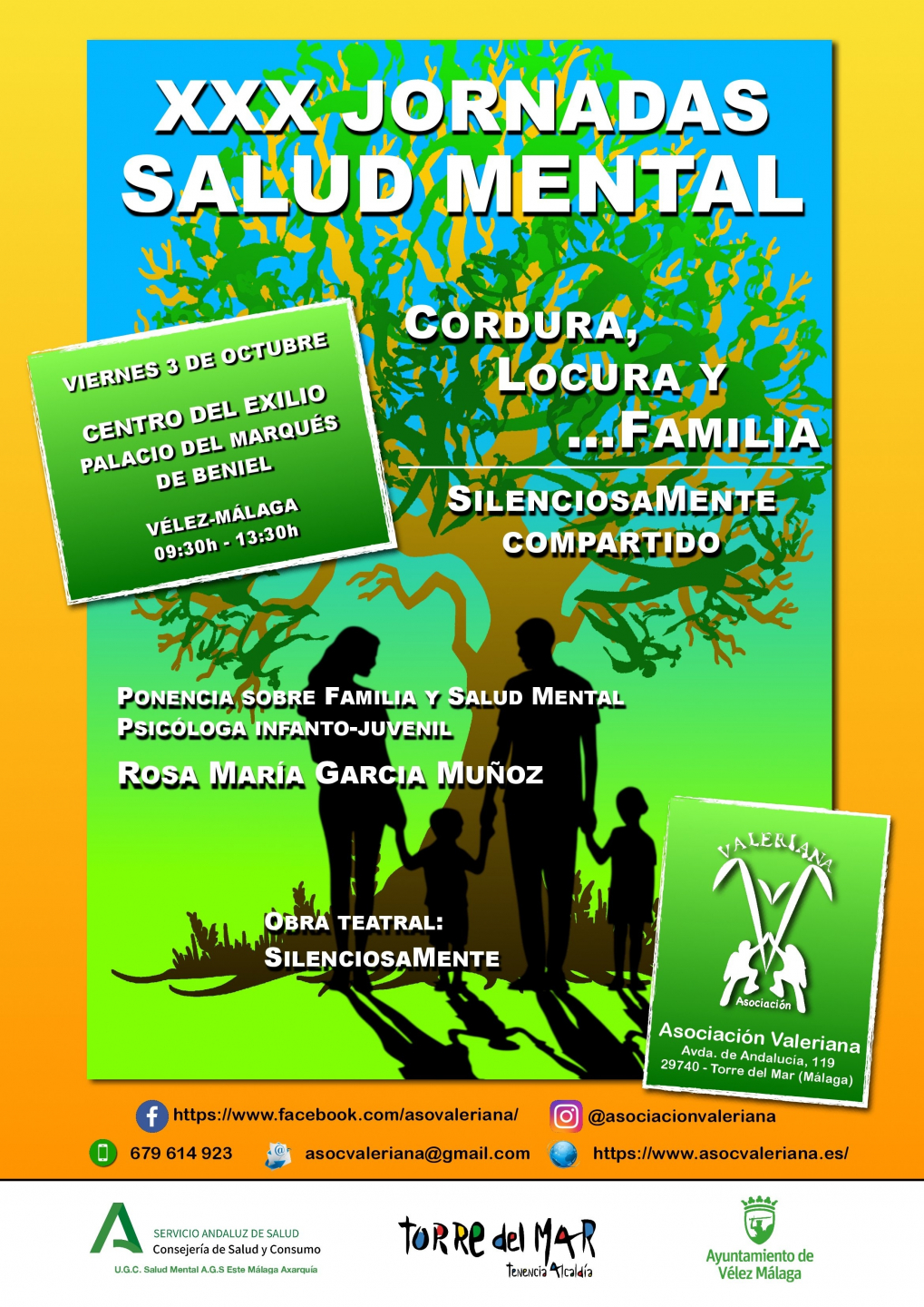 El Ayuntamiento de Vélez-Málaga y la Asociación para la Promoción y la Prevención de la Salud Mental “Valeriana” presentan la XXX edición de Jornadas de Salud Mental, que tendrán lugar el viernes 3 de octubre en el Centro del Exilio – Palacio del Marqués de Beniel. Esta jornada, que cuenta con la colaboración del Consistorio y la Consejería de Salud y Consumo de la Junta de Andalucía, está enfocada en la familia y su repercusión en la salud mental.
