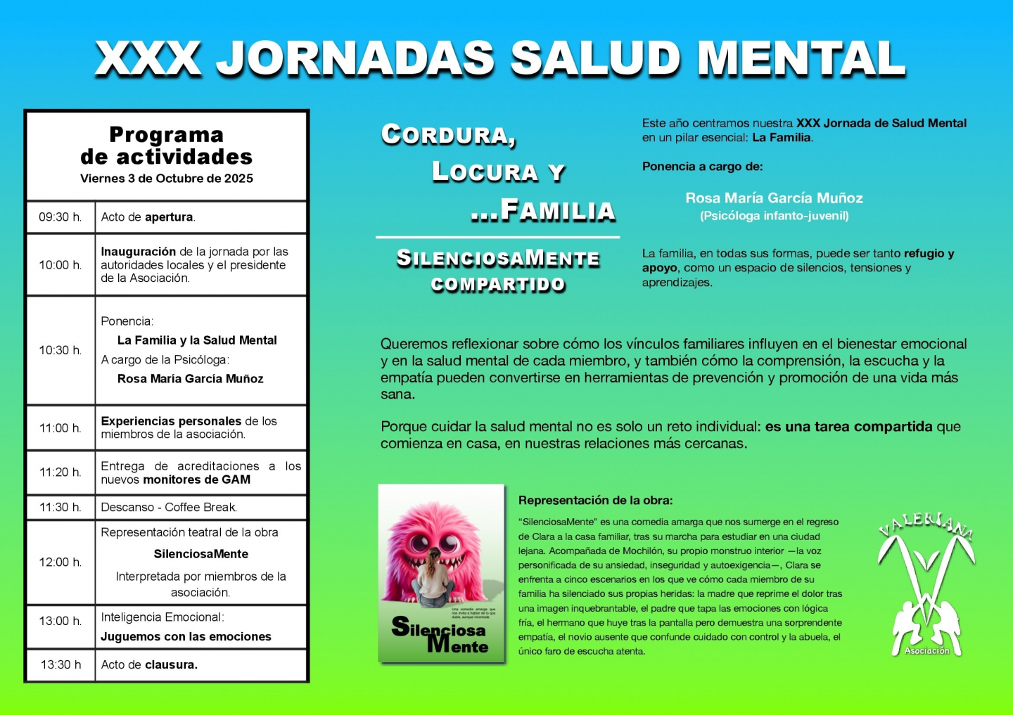La jornada arrancará a las 09:30 horas, las autoridades y el presidente de la asociación darán pie a la ponencia: “La familia y la salud mental”, a cargo de la psicóloga Rosa María García Muñoz. Seguido de esto, los miembros de Valeriana compartirán sus experiencias personales. Después se entregarán acreditaciones a los nuevos monitores de los Grupos de Ayuda Mutua (GAM), espacios seguros donde las personas pueden compartir sus experiencias y desafíos para sentirse comprendidos y acompañados en su viaje hacia la recuperación.