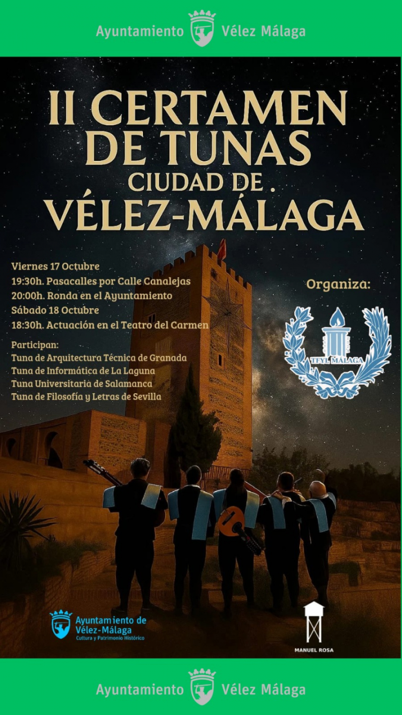 El próximo 17 y 18 de octubre, el centro histórico de Vélez-Málaga será de nuevo el escenario ideal para la puesta en valor de tunas pertenecientes a toda España. En esta ocasión, los grupos de: Aparejadores de Granada, Informática de la Universidad de La Laguna de Tenerife, Universidad de Salamanca, Filosofía y Letras de Sevilla y la de Filosofía y Letras de la Universidad de Málaga ofrecerán su música y su gracia para vivir dos días muy divertidos por las calles veleñas.