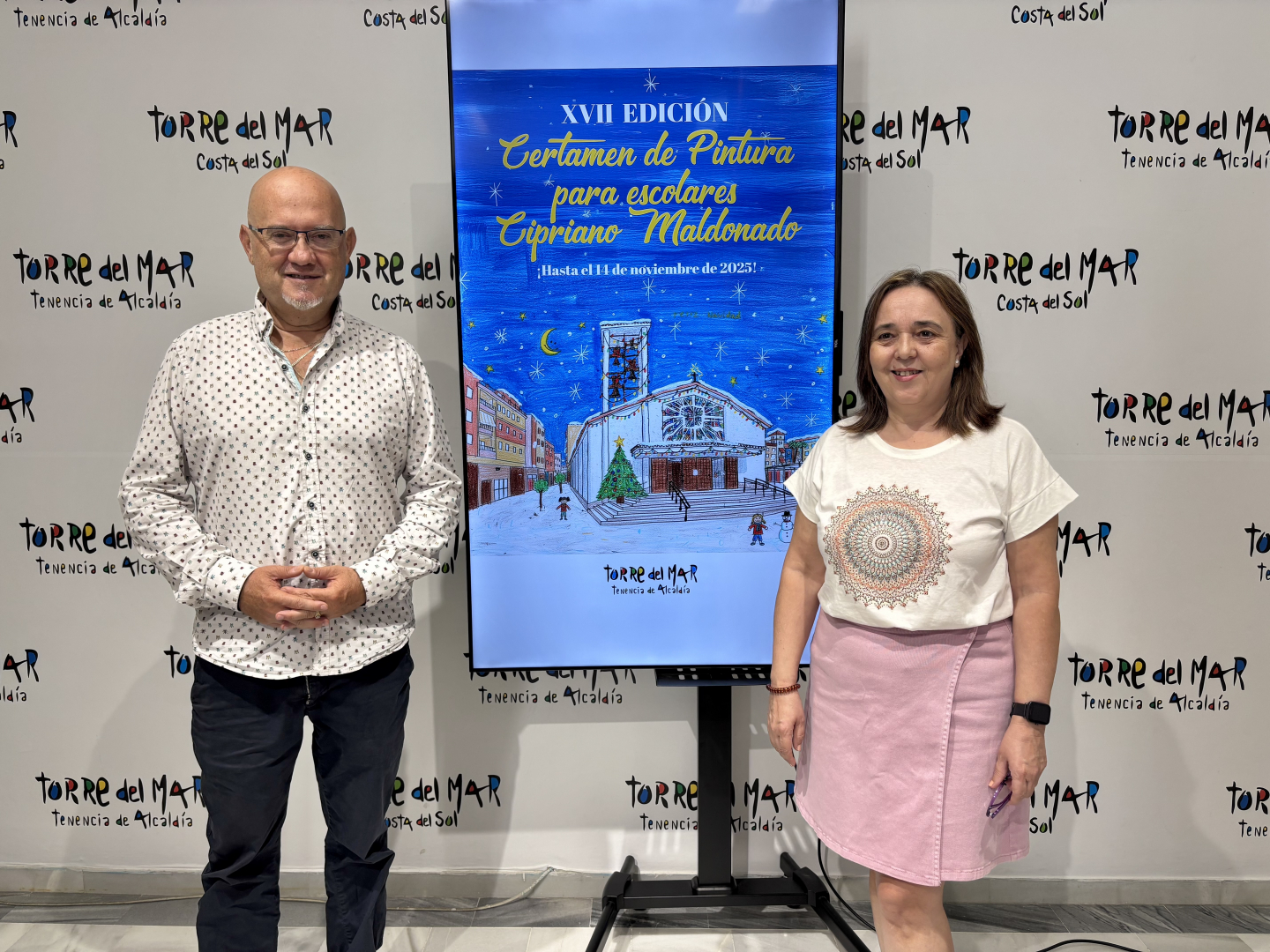 El primer teniente de alcalde del Ayuntamiento de Vélez-Málaga y teniente de alcalde de Torre del Mar, Jesús Pérez Atencia; junto a Mari Carmen Maldonado, han presentado la XVII edición del Certamen de Pintura Escolar ‘Cipriano Maldonado’, que como cada año propone un dibujo navideño a los niños y niñas de Torre del Mar para buscar su postal de felicitación navideña y premiar la creatividad de los más jóvenes de nuestro pueblo.