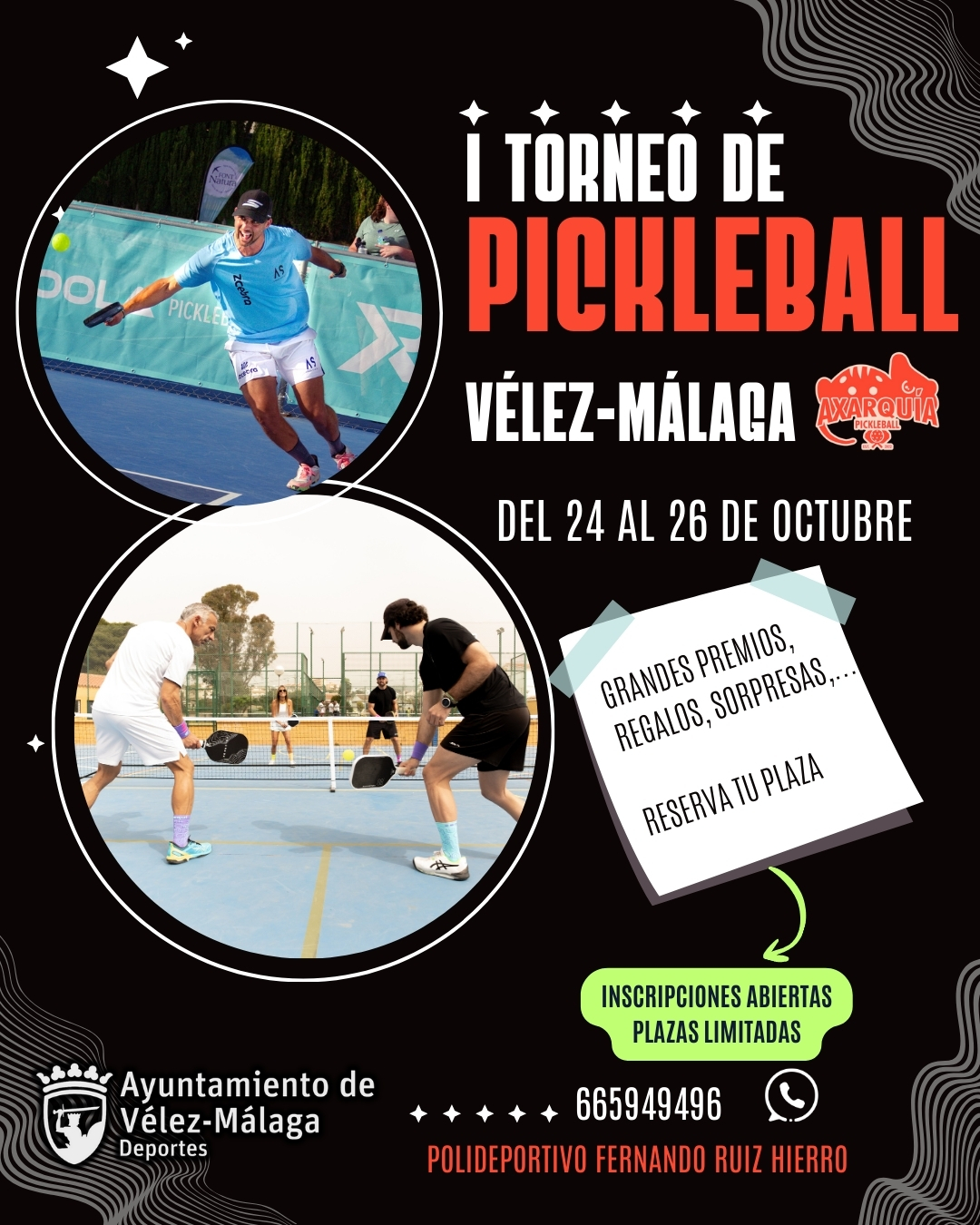 El Ayuntamiento de Vélez-Málaga, a través de la Concejalía de Deportes, organiza la primera edición del Torneo de Pickleball en Vélez-Málaga, un deporte en auge y cada vez más practicado en el municipio. La cita tendrá lugar del 24 al 26 de octubre y se celebrará en el Polideportivo Fernando Hierro.