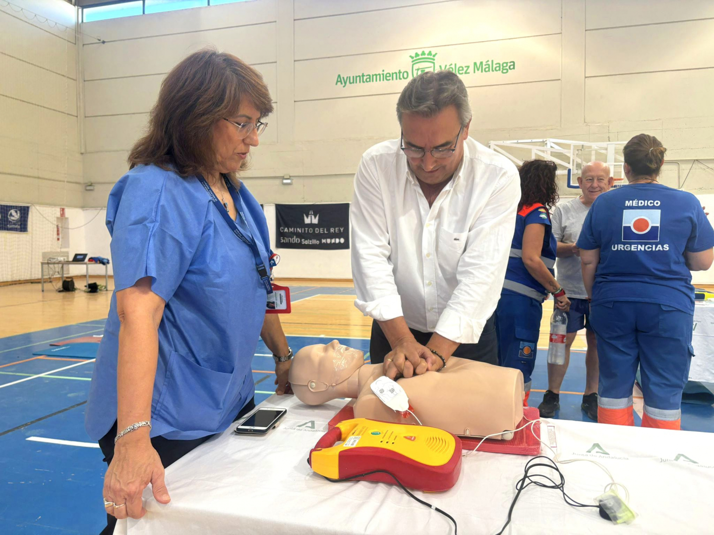 La iniciativa programada por el organismo sanitario se integra, a su vez, en el capítulo de propuestas planificadas por un grupo de profesionales sanitarios de la unidad de Urgencias, de la UCI y de otras unidades del AGS Este de Málaga-Axarquía. En la inauguración han estado presentes el teniente de alcalde de Torre del Mar, Jesús Pérez Atencia, el concejal de Deportes veleño, Manuel Gutiérrez, y el edil de Salud, Juan Fernández Olmo, acompañados en el transcurso de la cita por la subdirectora médica del servicio 061 en Andalucía, Inmaculada Herruzo, además del personal encargado de instruir a los usuarios.