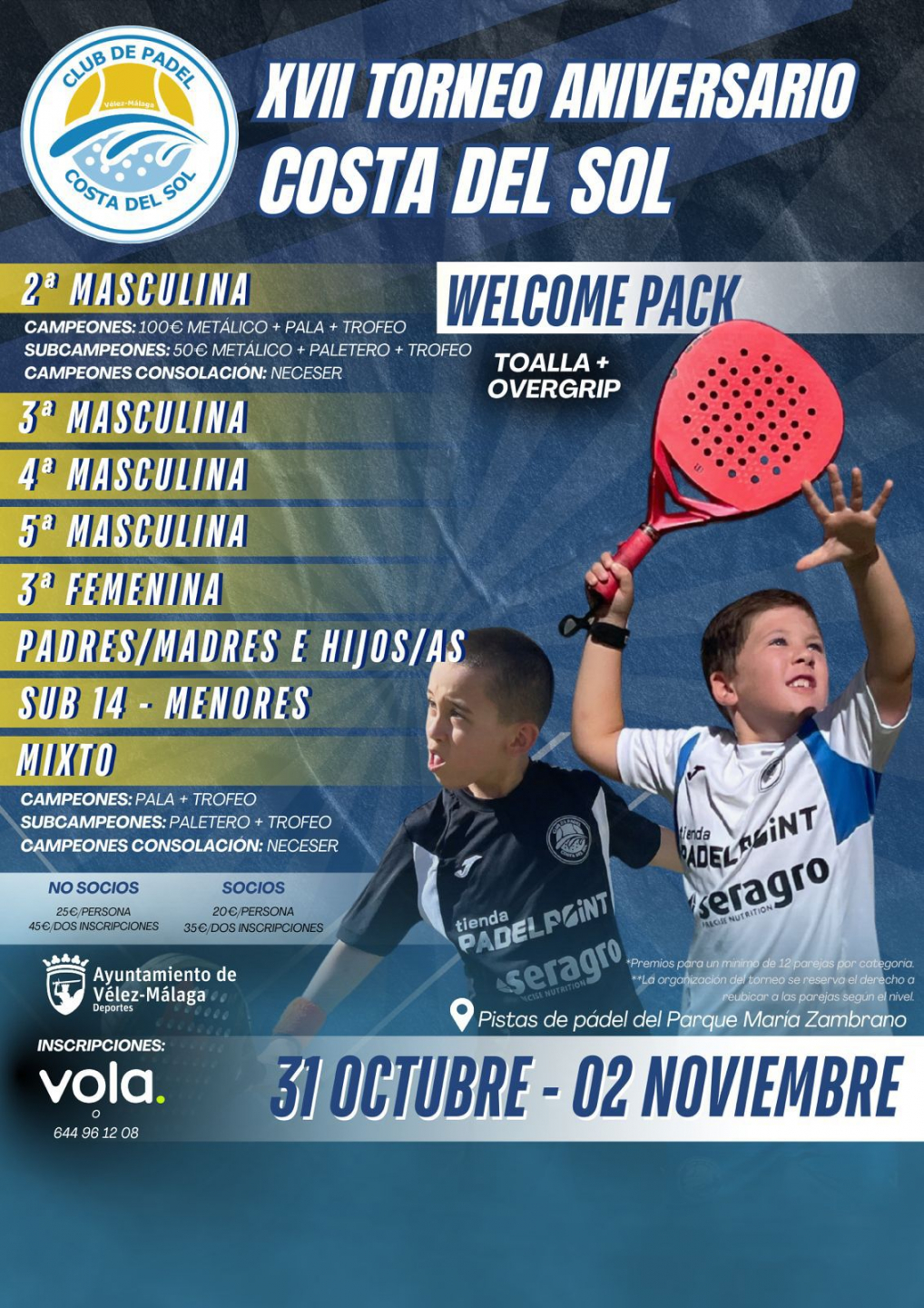 La Concejalía de Deportes del Ayuntamiento de Vélez-Málaga reafirma su compromiso con la celebración de encuentros deportivos de primer nivel con la acogida el próximo fin de semana, del 31 de octubre al 2 de noviembre, el XVII Torneo Aniversario Costa del Sol de pádel, una convocatoria que congregará a competidores de alta escuela procedentes de toda la provincia de Málaga y que entrarán en escena en las pistas del Parque María Zambrano.
