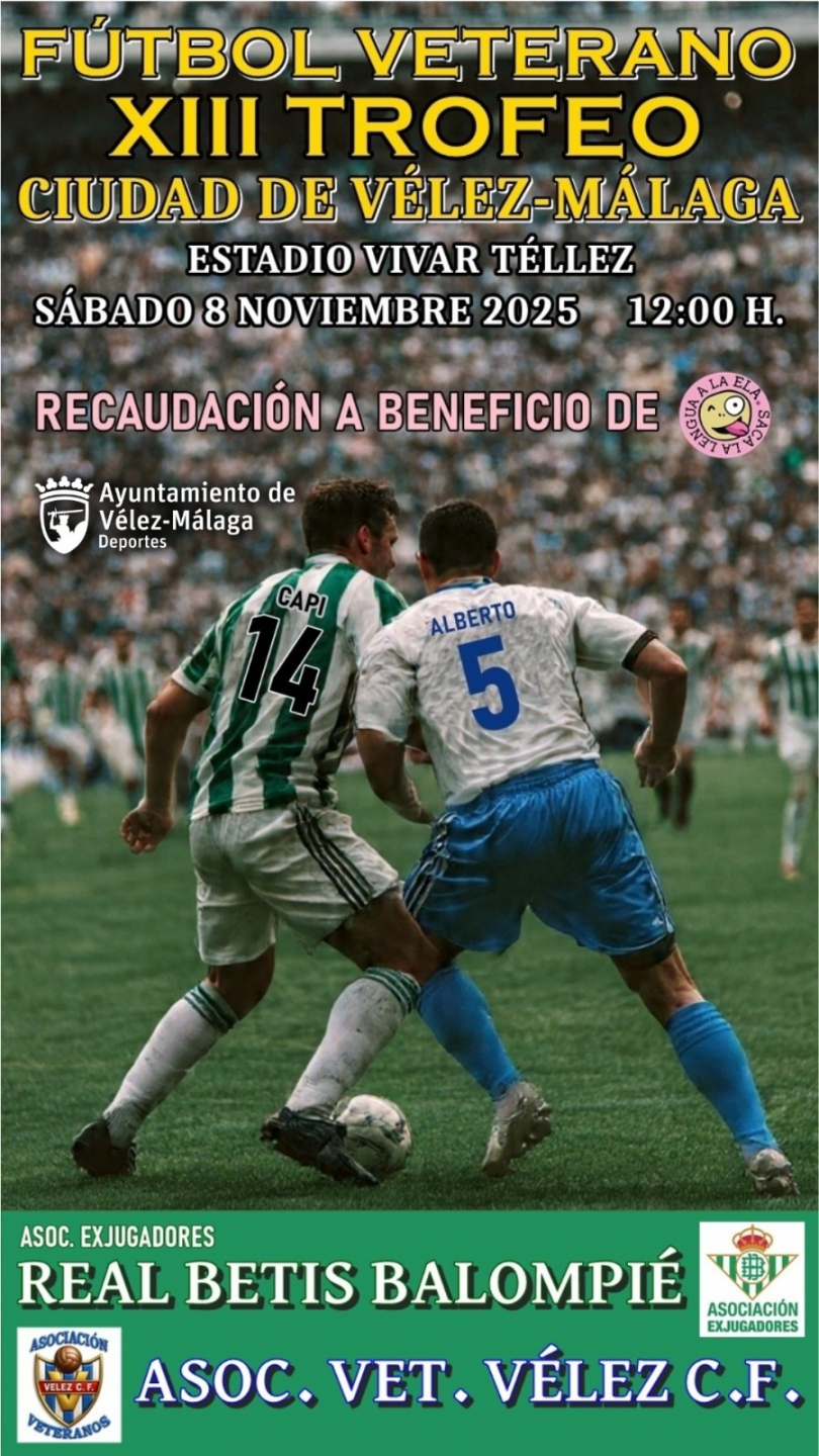 Vélez-Málaga respira fútbol por los cuatro costados y la apuesta de la Concejalía de Deportes va encaminada a respaldar y potenciar todo tipo de iniciativas en las que el considerado deporte Rey disponga de su cuota de protagonismo. En esta línea, el concejal de Deportes, Manuel Gutiérrez, acompañado por el presidente de la Asociación de Veteranos Vélez C. F., Francisco Alba, e integrantes del equipo, ha anunciado la celebración de una destacada convocatoria para el próximo 8 de noviembre. El Vivar Téllez acogerá el XIII Trofeo Ciudad de Vélez-Málaga de Fútbol Veterano, que pondrá en liza, a partir de las 12:00 horas, a la Asociación de Veteranos Vélez C.F. y a la Asociación de Exjugadores del Real Betis Balompié. El coste de la entrada es de 3 euros.