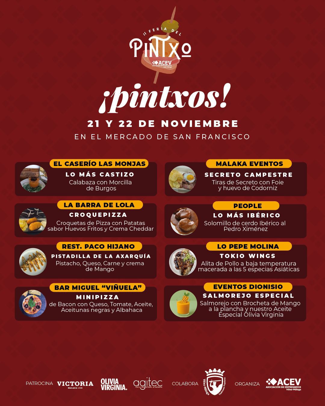 Un total de ocho restaurantes participarán este fin de semana en la II Feria del Pintxo de Vélez-Málaga, cada uno con una propuesta propia con la que buscarán conquistar al público asistente. El evento se celebrará el viernes y el sábado a partir de las 13.00 horas. Los establecimientos y sus pintxos son los siguientes: Caserío Las Monjas (Calabaza con morcilla de Burgos); Barra de Lola (Croquetas de pizza con patatas sabor a huevos fritos y crema cheddar); Paco Hijano (Pistacho, queso, carne y crema de mango); Malaka Eventos (Tiras de secreto con foie y huevo de codorniz); Eventos Dionisio (Salmorejo con brocheta de mango a la plancha y aceite especial Oliva Virginia); Lo Pepe Molina (Alita de pollo a baja temperatura macerada con cinco especias asiáticas); Bar Miguel “Viñuela” (Bacon con queso, tomate, aceite, aceitunas negras y albahaca) y People (Solomillo de cerdo ibérico al Pedro Ximénez).