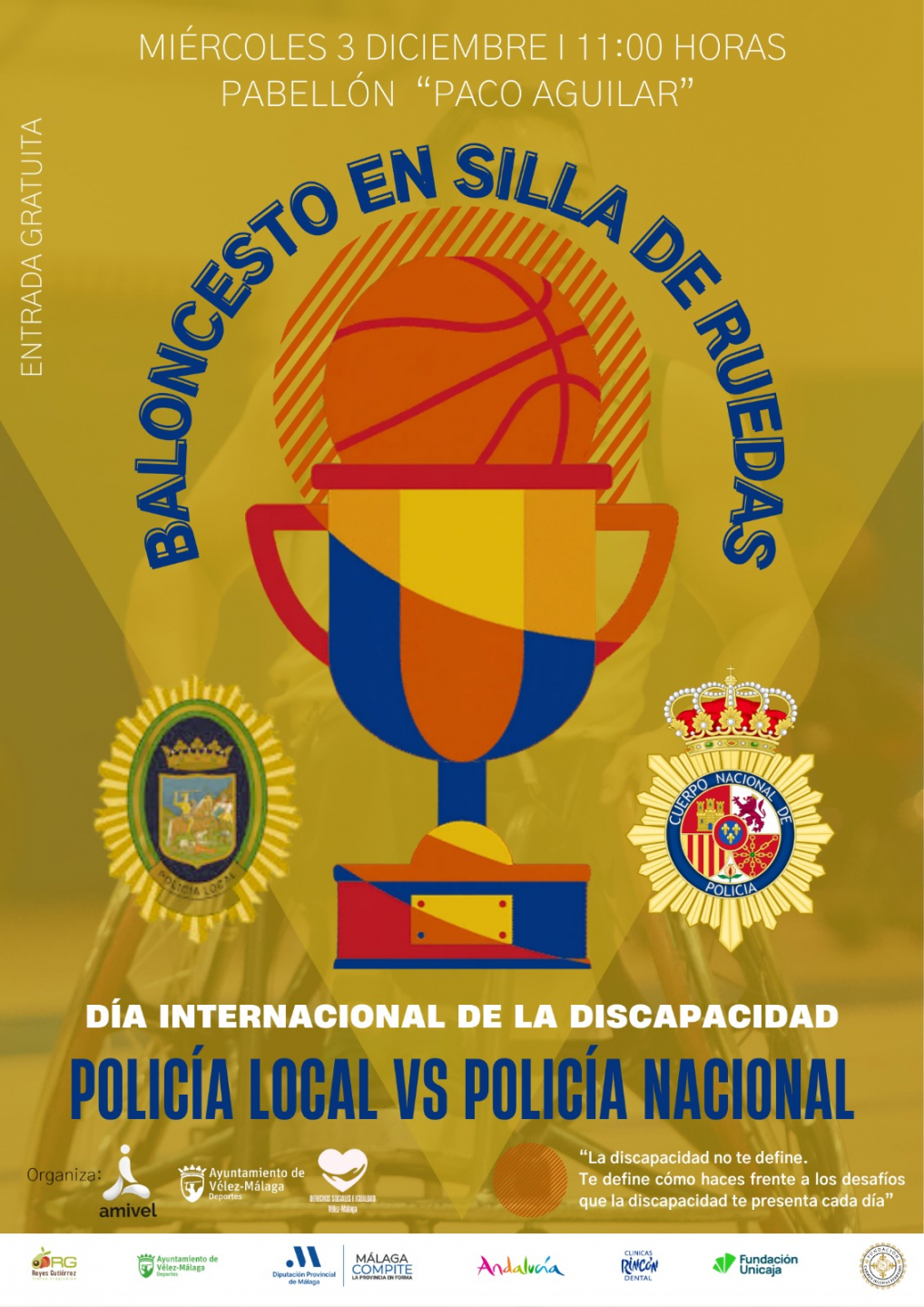 El Ayuntamiento de Vélez-Málaga refuerza su compromiso con las políticas sociales en favor de las personas, sumándose al acto conmemorativo del Día Internacional de las Personas con Discapacidad, que se celebrará el próximo 3 de diciembre. Organizado por la Asociación de Minusválidos Veleños y Axarquía (AMIVEL), el evento consistirá en un partido de baloncesto en silla de ruedas entre la Policía Local y la Policía Nacional, que tendrá lugar a las 11:00 horas en el Pabellón 'Francisco Aguilar'. La entrada será gratuita.