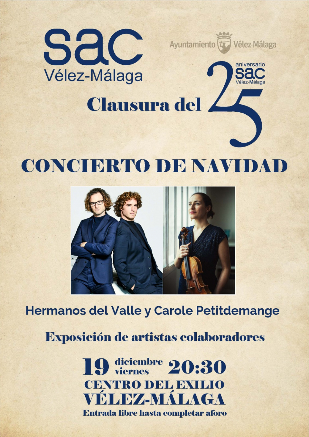A comienzos del siglo XXI nació en Vélez-Málaga la Sociedad de Amigos de la Cultura (SAC), una asociación que, durante 25 años, ha trabajado incansablemente en la conservación y defensa del patrimonio histórico y cultural de la capital de la Axarquía. A pocas semanas de cerrar el año, la entidad, junto a la Concejalía de Cultura del Ayuntamiento, ha organizado un Concierto de Navidad para clausurar su 25 aniversario. Los Hermanos del Valle, acompañados de la virtuosa violinista Carole Petidemange, serán los encargados de amenizar la velada, que se celebrará el próximo 19 de diciembre a las 20:30 horas en el Centro del Exilio.