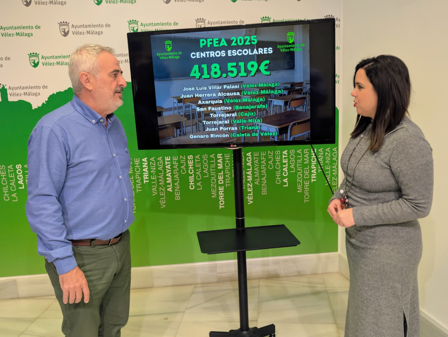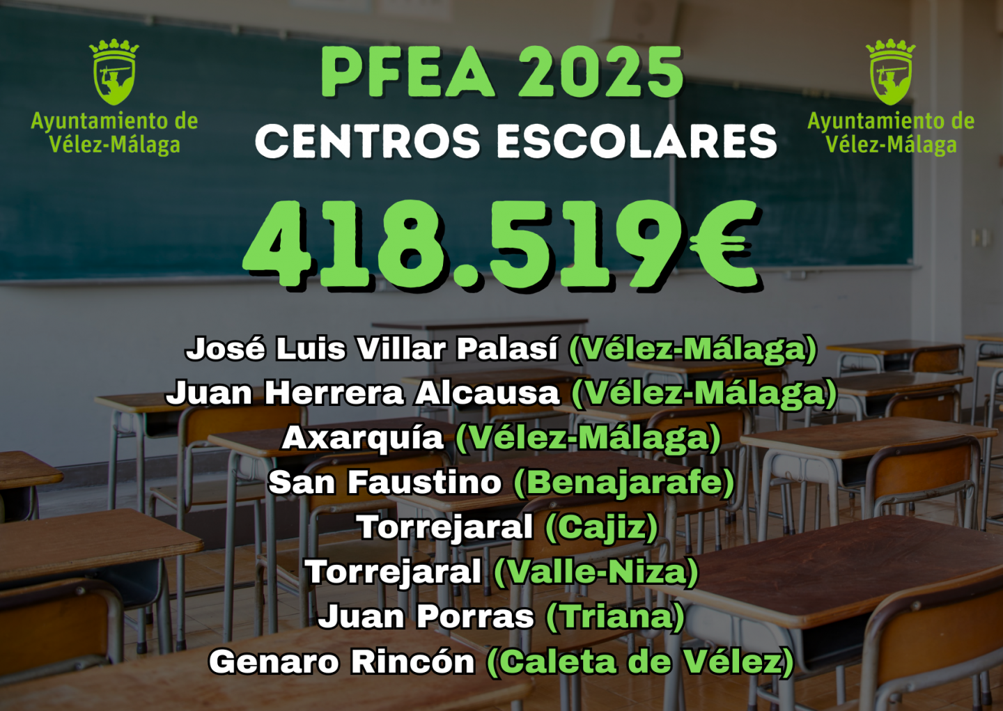 El Ayuntamiento de Vélez-Málaga impulsa la educación local con una inversión de 418.519 euros destinada a reforzar y mejorar ocho centros educativos del municipio: José Luis Villar Palasí, Juan Herrera Alcausa y Axarquía (Vélez-Málaga), San Faustino (Benajarafe), Torrejaral (Cajiz), Torrejaral (Valle-Niza), Juan Porras (Triana) y Genaro Rincón (Caleta de Vélez). Las actuaciones, financiadas por el Programa de Fomento de Empleo Agrario (PFEA) 2025, cuentan con un plazo de ejecución de siete meses y medio e incluyen la eliminación de barreras arquitectónicas, la adecuación de instalaciones y la renovación de pintura, entre otras mejoras, garantizando espacios más accesibles, seguros y funcionales para alumnos y docentes.