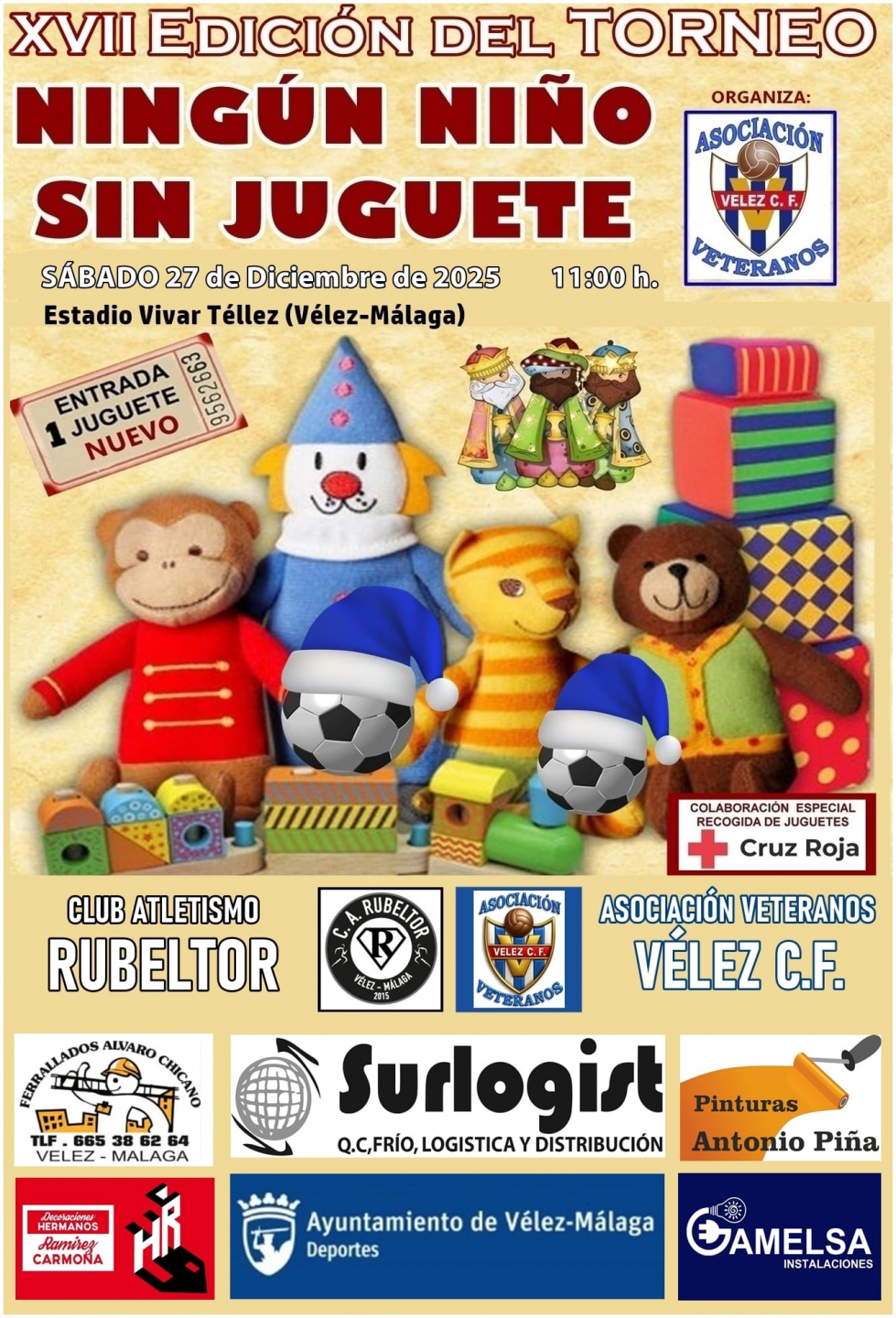 El sábado 27 de diciembre, a las 11:00 horas, la Asociación de Veteranos del Vélez Club de Fútbol organizará un encuentro solidario frente al Club Atletismo Rubeltor. Este torneo, enmarcado en la campaña ‘Ningún Niño Sin Juguete’, alcanza su decimoséptima edición, consolidándose como una de las iniciativas solidarias más emblemáticas del municipio.