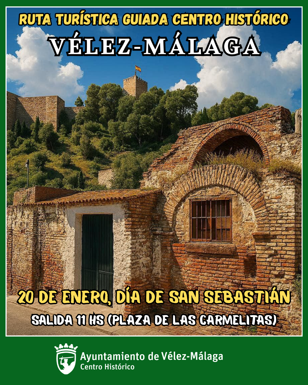 La Concejalía del Centro Histórico del Ayuntamiento de Vélez-Málaga continúa su labor de poner en valor los tesoros históricos de la ciudad. Con motivo del día de San Sebastián, patrón de Vélez-Málaga, vecinos y visitantes podrán participar en una ruta guiada que permitirá descubrir los edificios más emblemáticos de la ciudad, acompañados por un guía turístico. La jornada arrancará a las 11 horas en la Plaza de las Carmelitas e incluirá visitas al Real Convento de San Francisco, a la Iglesia de Santa María de la Encarnación, la Fortaleza, las Murallas nazaríes, el Barrio de La Villa y la Ermita de San Sebastián.