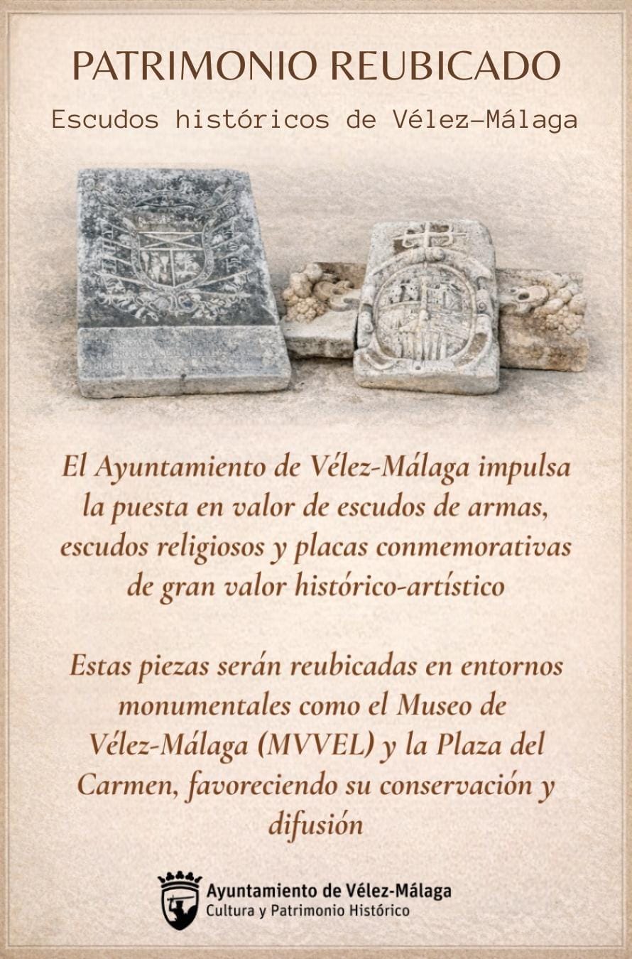 El Ayuntamiento de Vélez-Málaga, a través de su Concejalía de Cultura y Patrimonio, ha anunciado la reubicación de una destacada colección de escudos y piezas de contrastado valor histórico artístico para la ciudad en diferentes rincones monumentales del municipio más acordes al significado conmemorativo que estas piezas atesoran. Así lo ha puesto de manifiesto el alcalde veleño, Jesús Lupiáñez, que ha reivindicado la necesidad de poner en valor aquellos elementos patrimoniales que constituyen y construyen el legado y la identidad de la capital de la Axarquía.