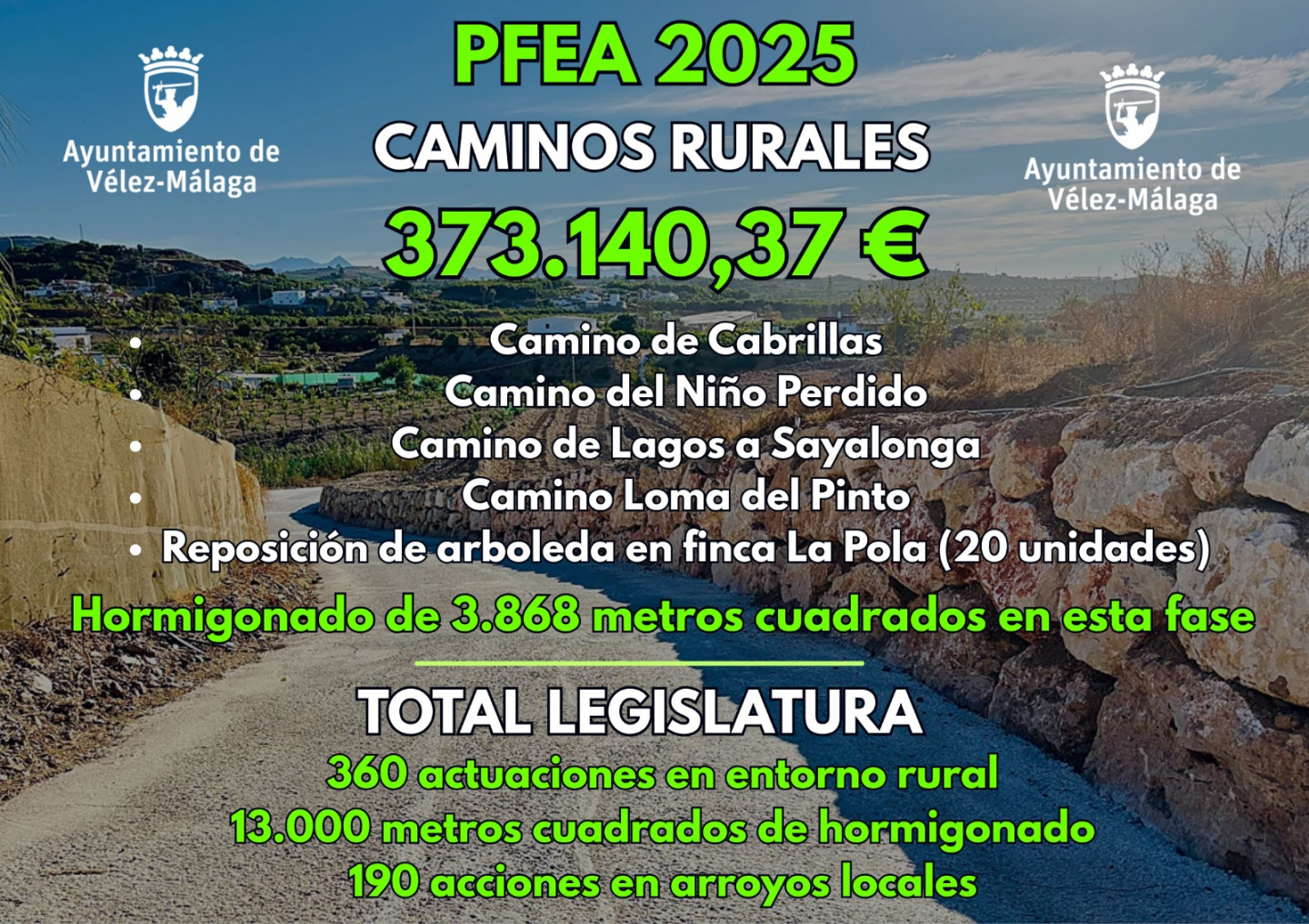 Los cinco proyectos a acometer se suman a las más de 360 acciones ejecutadas hasta la fecha por el Gobierno local en la presente legislatura. El presupuesto asignado, en este caso, asciende a 373.140,37 euros, y se estima un periodo de ejecución de unos 7 meses, sujeto a posibles incidencias ajenas al curso normal de los trabajos, con la implementación de una extensión de hormigonado sobre más de 3.868 metros cuadrados. En cómputo global en la presente legislatura, se han realizado trabajos de hormigonado sobre más de 13.000 metros cuadrados del mapa rural de Vélez-Málaga. Igualmente, se han acometido 190 acciones en arroyos locales.
