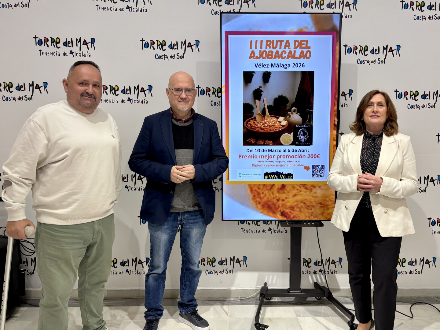 El primer teniente de alcalde del Ayuntamiento de Vélez-Málaga y teniente de alcalde de Torre del Mar, Jesús Pérez Atencia; la concejala de Industria y Comercio, Beatriz Gálvez; y el gerente de Axarquía Me Gusta, César Díaz, han presentado una nueva edición de la Ruta del Ajo Bacalao, una propuesta enmarcada en la Cuaresma y orientada a seguir poniendo en valor uno de los platos más representativos, tradicionales y exclusivos de la gastronomía veleña.