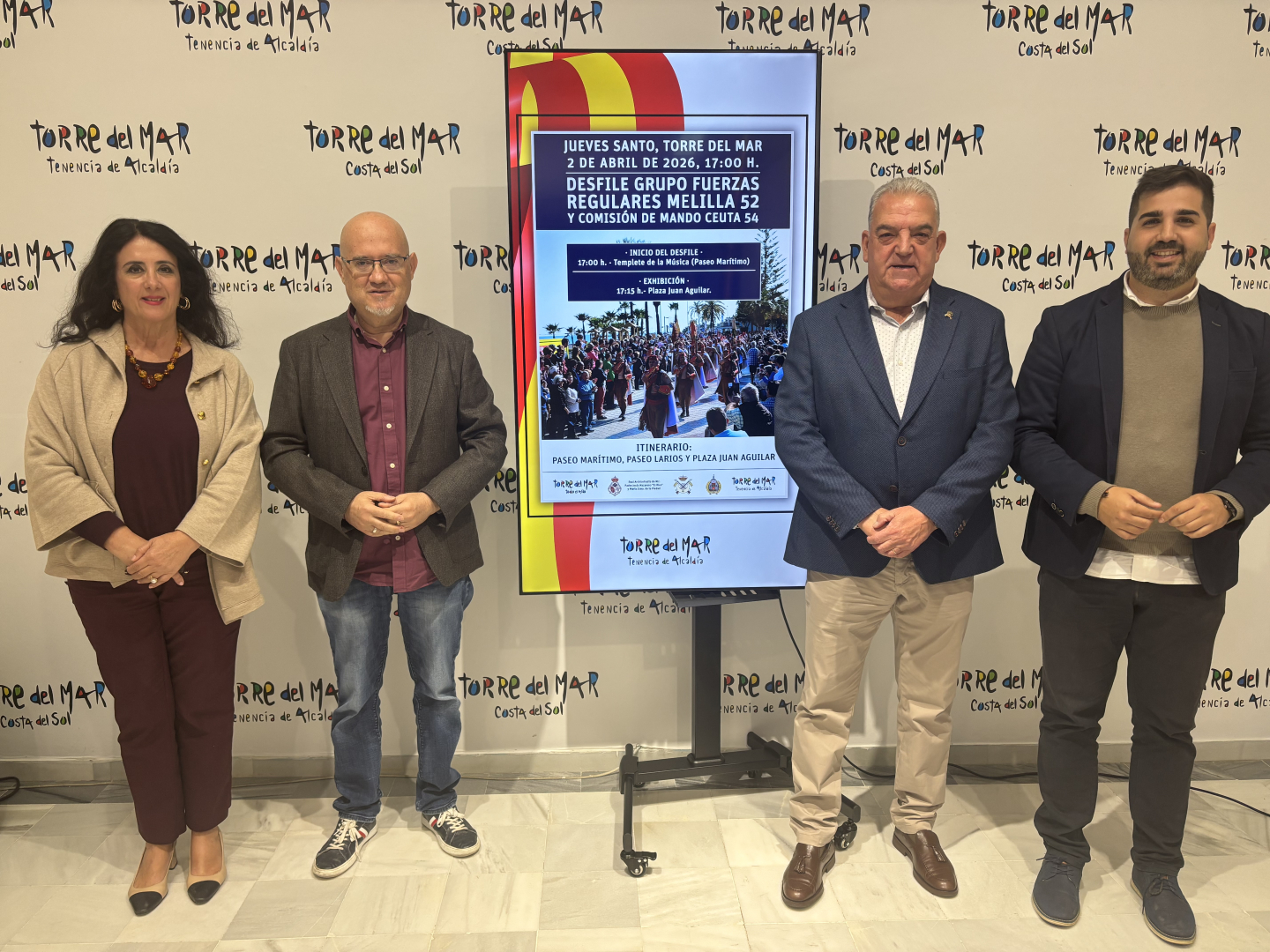 Durante su intervención, Jesús Pérez Atencia agradeció la presencia de José Luis Ramos y puso en valor la importancia de esta cita dentro del calendario local. “Hemos convocado esta comparecencia desde la Concejalía de Turismo del Ayuntamiento de Vélez-Málaga para informar acerca de uno de los actos más esperados de la Semana Santa en nuestro municipio, como es el desfile y la exhibición del Ejército de los Regulares, que se celebrará el próximo Jueves Santo por la tarde en Torre del Mar”, señaló.