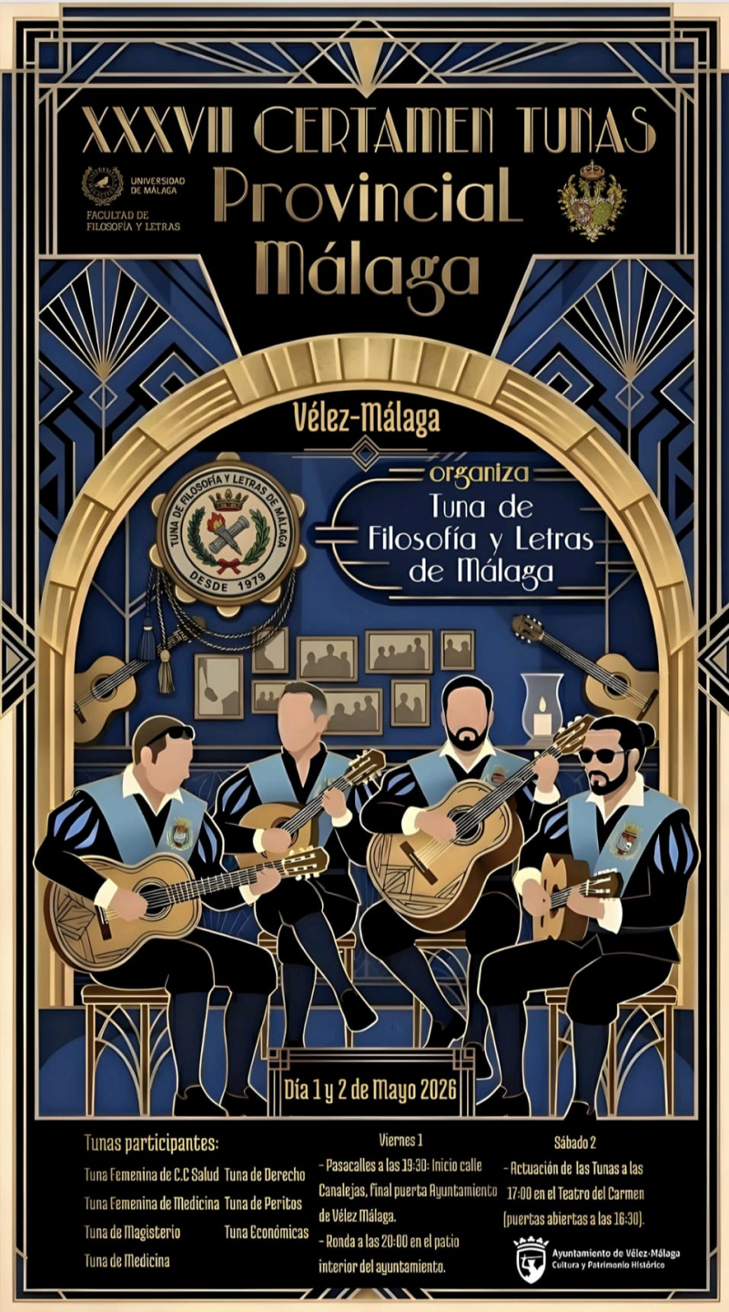 Vélez-Málaga volverá convertirse los días 1 y 2 de mayo en capital de la provincia malagueña en la interpretación musical de tuna, con la celebración del Certamen Provincial, que cumple su XXXVII edición trayendo consigo a agrupaciones que nos deleitarán con sus composiciones y melodías características.