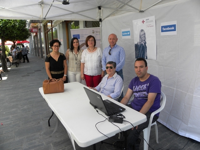La concejala de Empresa y Empleo, Lourdes Piña, en compañía de la presidenta de la asociación, Isabel Gutiérrez, y otras representantes de la junta directiva, ha visitado el stand instalado en la calle Poeta Joaquín Lobato desde el que trabaja este dinamizador de redes sociales.